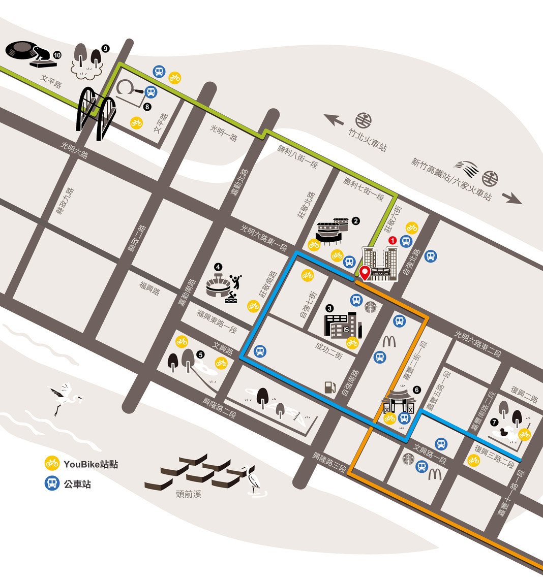 光明六路莊敬六街口→新竹縣體育場→文興路莊敬南路口→新瓦屋客家文化保存區→水圳森林公園