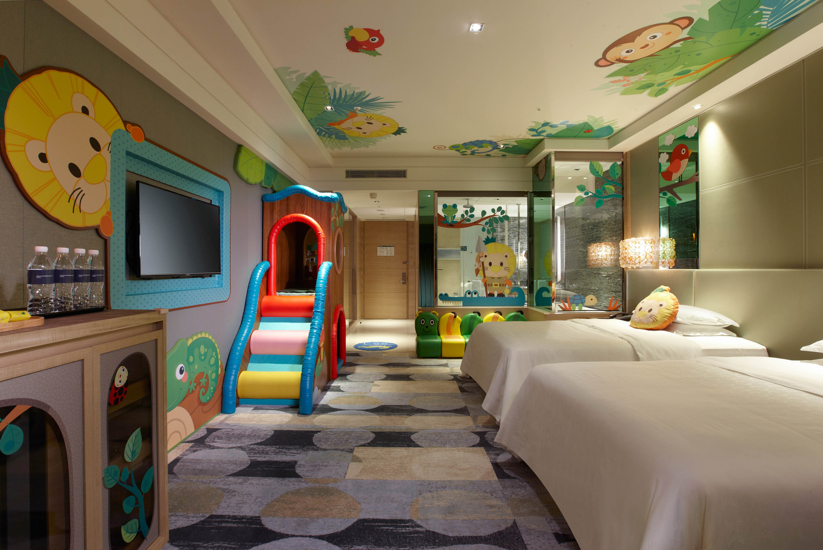 夢幻版房型為兩小床雙人房,共有兩大主題──波波星球及冒險森林,配有雙層爬坡秘密基地(非溜滑梯)、童話閱讀區及專屬喜波波兒童備品。